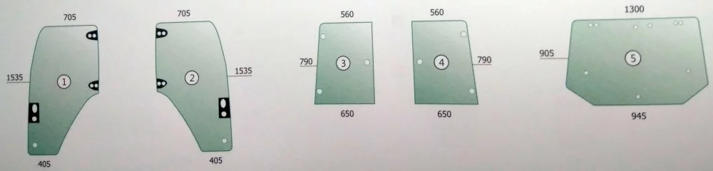 Стекла для техники New Holland TM 115, 120, 125, 130, 135, 140, 150, 155, 165, 175, 190 T 5030, 5040, 5050, 5060, 5070 TLA 70A, 80A, 90A, 100A TS 90, 100, 110, 115